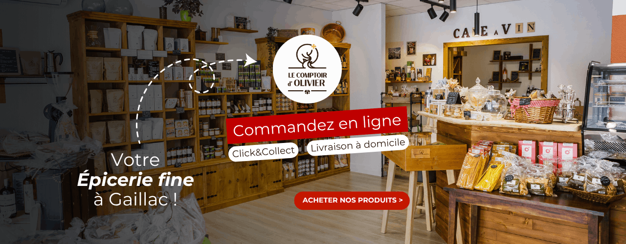Bienvenue au Comptoir d’Olivier, votre épicerie fine à Gaillac et en ligne, dédiée aux produits du terroir français et aux plaisirs gourmands. Dans notre boutique du centre-ville ou via notre boutique en ligne, nous vous proposons une sélection exigeante de produits artisanaux, locaux et de qualité : vins de Gaillac, foie gras du Sud-Ouest, terrines et pâtés, confitures maison, chocolats artisanaux, thés, cafés et douceurs d’antan.