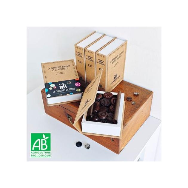 Les plaisirs du palais s'accordant avec ceux de l'esprit, Le Chocolat de poche décline sa boîte-livre à succès autour de délicieux chocolats noir 74% et lait 45% BIO en forme de boutons.